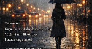 Aşka Söz Ne öz bilirdim ne söz Bakışın canıma değdi Açıldı gönlüme göz Boynumu aşkına eğdi Ayrılık yağmurdan köz Damlası canımı deldi Aşkmış varlığıma töz Ben denen yokluğu sildi İlker Ko / 2c5474 Haziran 2025
